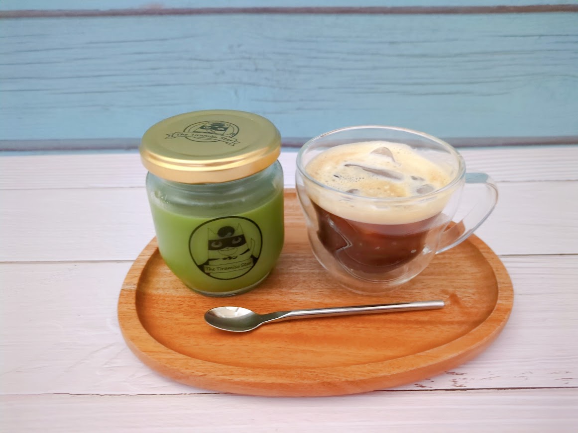 中身は森半の抹茶プリン。これが激ウマ。お湯を入れるだけで簡単に作れるけど、固まり具合も絶妙で、カフェで出せると思うレベルに。